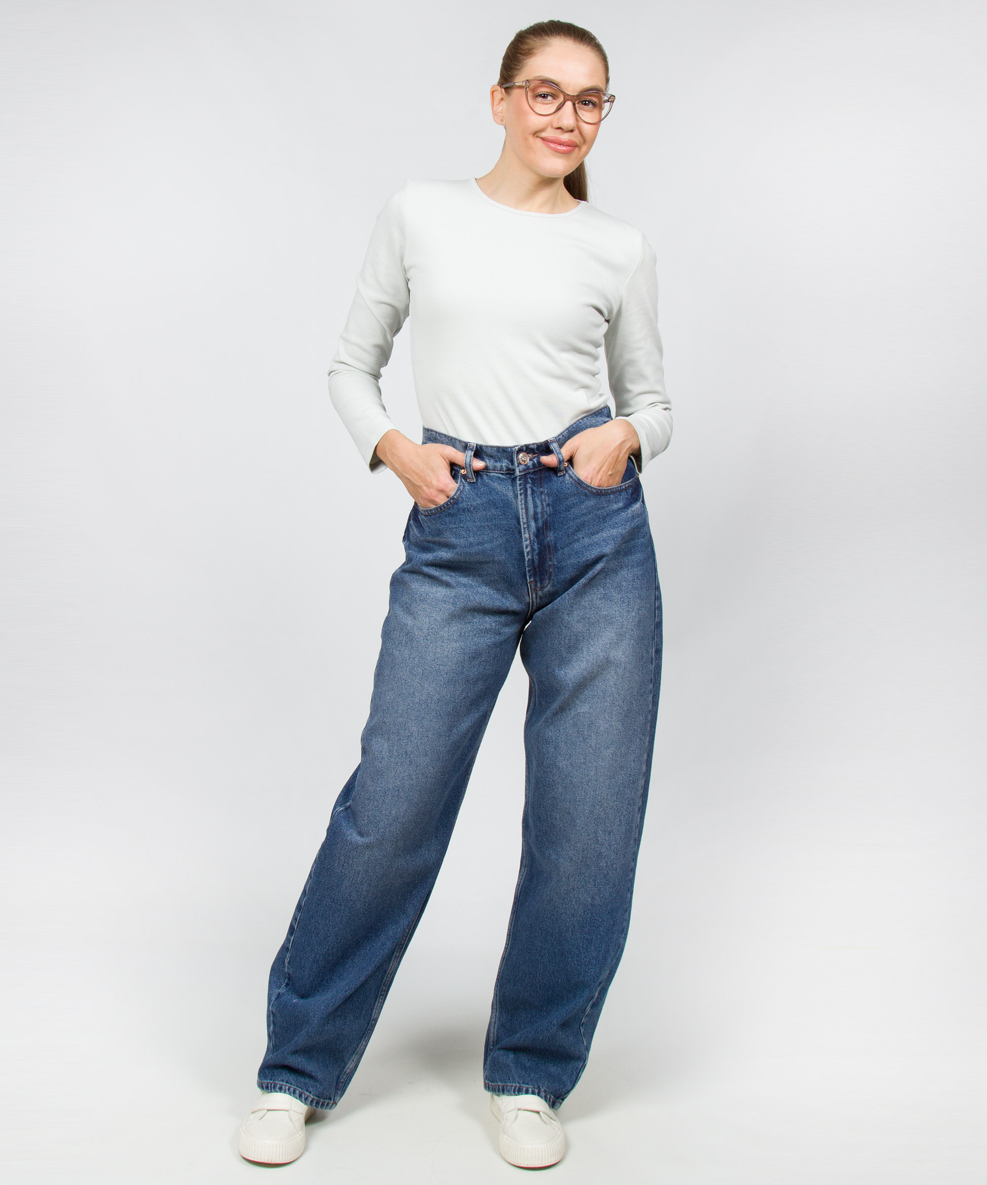 Джинсы от WHITNEY выполнены из натурального хлопка. У модели высокая посадка; свободный фасон; синий цвет с эффектом легкой потертости; пять функциональных карманов.