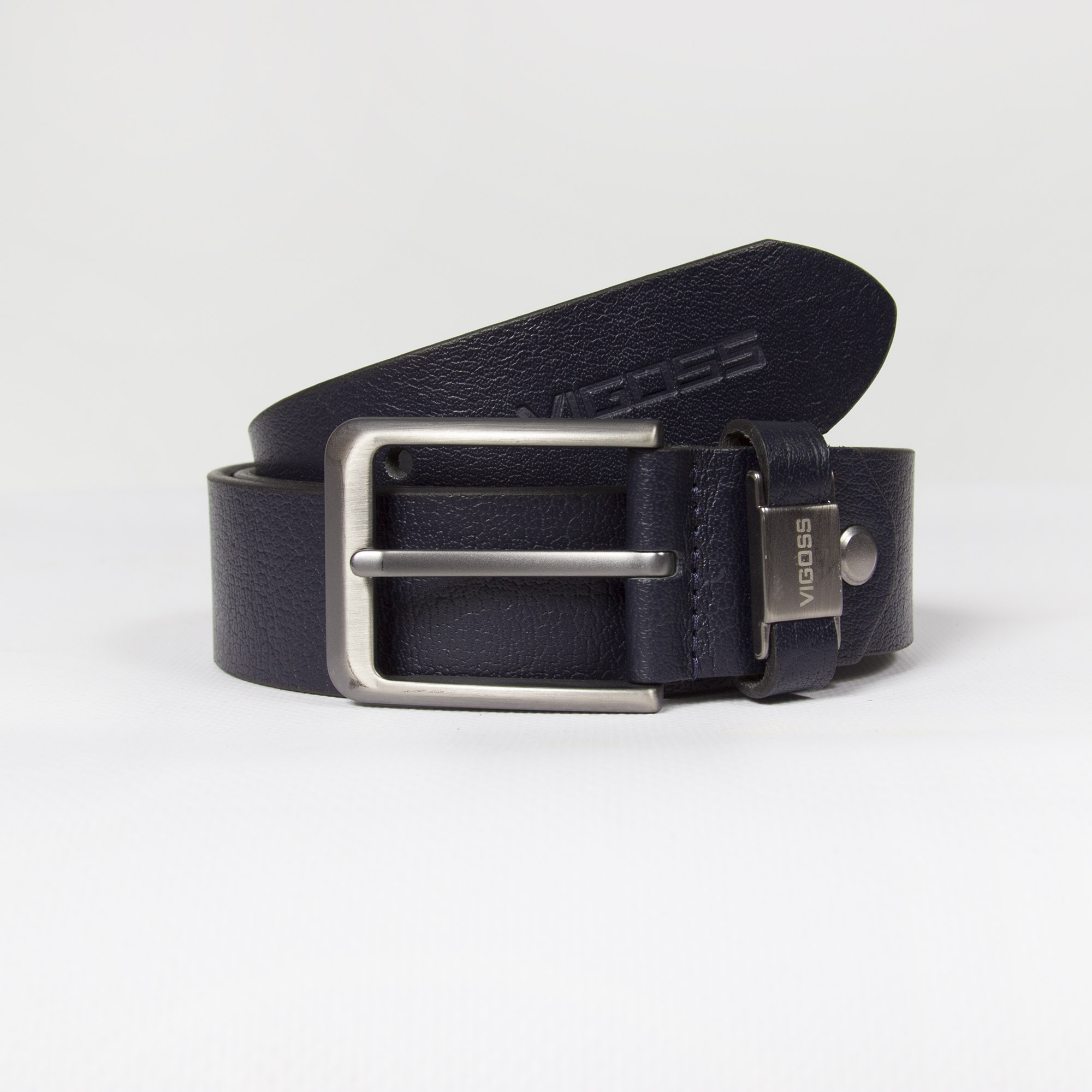 Ремень VIGOSS выполнен из натуральной кожи темно-синего цвета с оригинальным узором. Длина ремня регулируется под необходимый размер за счет съемной пряжки. Ширина ремня соответствует стандартным размерам джинсовых шлевок. Пряжка выполнена из полированного металла стального цвета.
